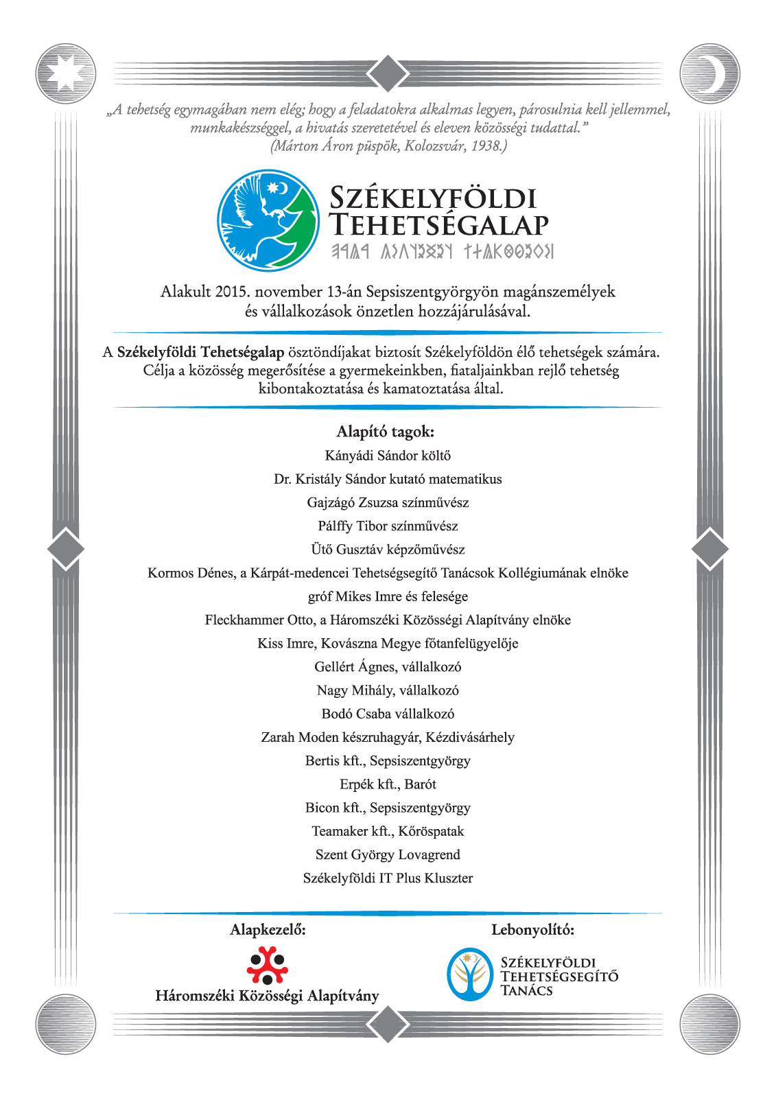 A pályázatok támogatására rendelkezésre álló keretösszeg Székelyföldön: 60 000 Ron, amelyet a Háromszéki Közösségi Alapítvány által 2015-ben alapított Székelyföldi Tehetségalap biztosít, háromszéki vállalkozók, neves közéleti személyiségek közreműködésével.